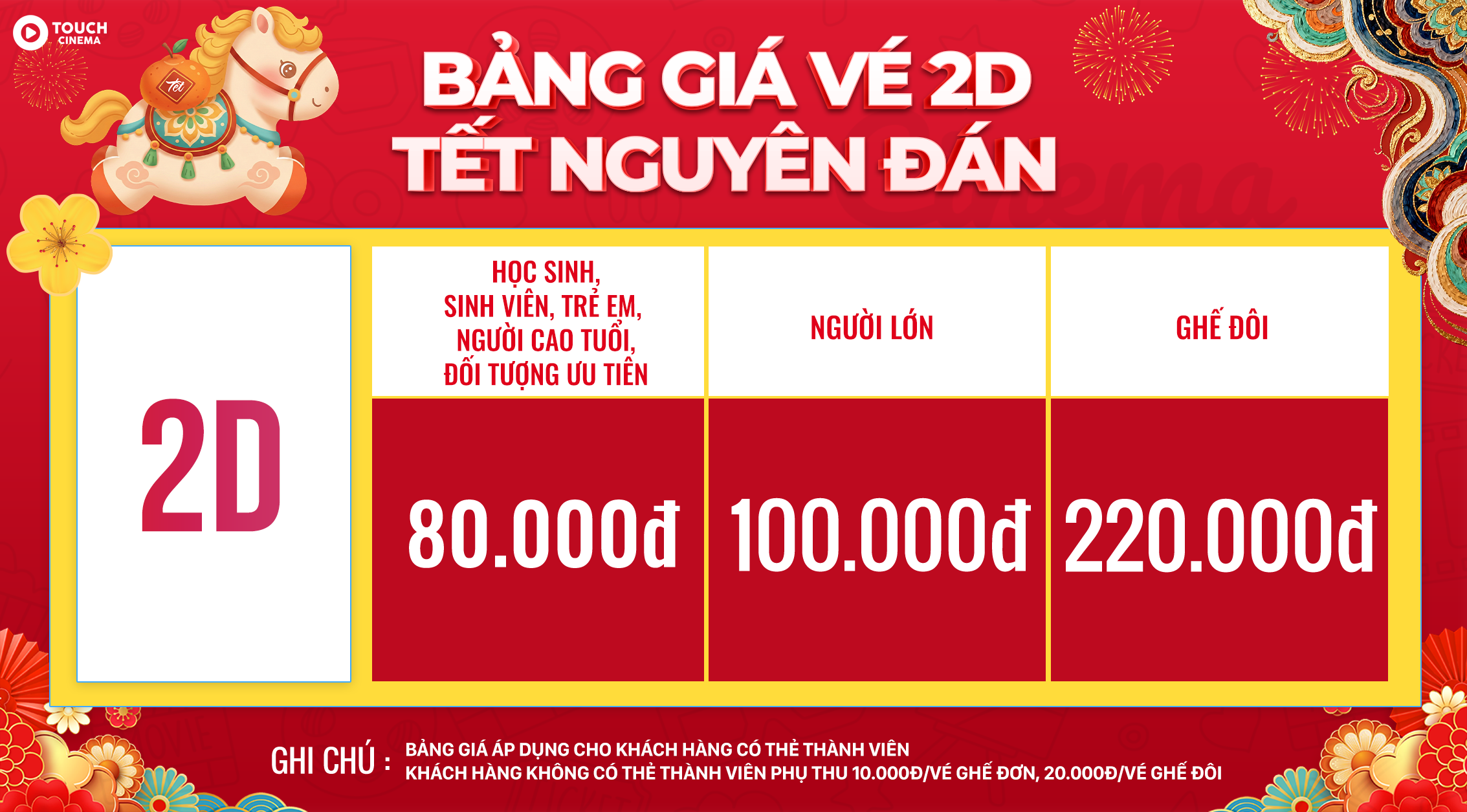 - Bảng giá trên áp dụng cho khách hàng có thẻ thành viên, khách hàng không có thẻ thành viên phụ thu 10.000đ/vé đối với ghế thường, 20.000đ/vé đối với ghế đôi